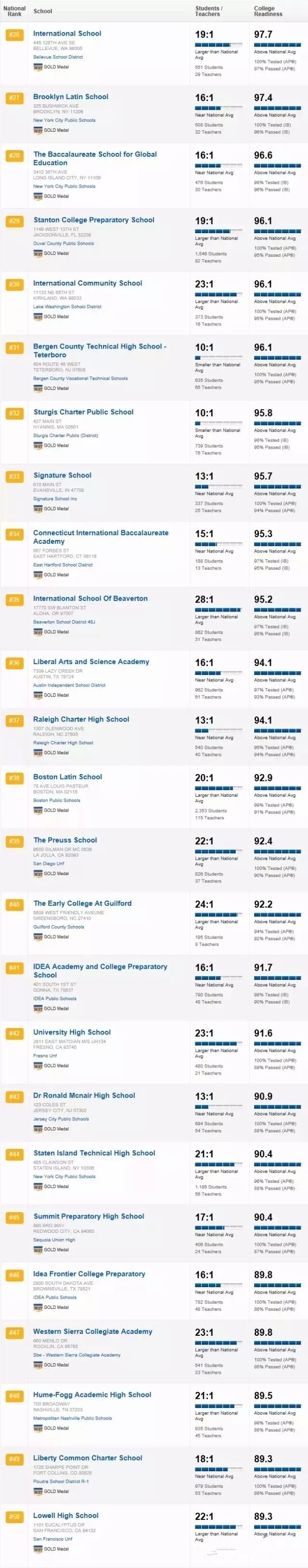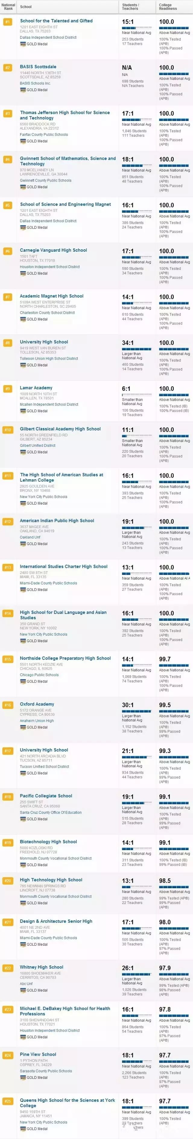 排名第一的天才学校(The School for the Talented and Gifted)位于达拉斯州。而在前100名学校中,德克萨斯州占据最多。其次是加州与纽约州。